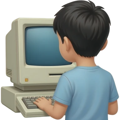 一个中国小男孩背对着一台 apple II 台式机在使用电脑 emoji