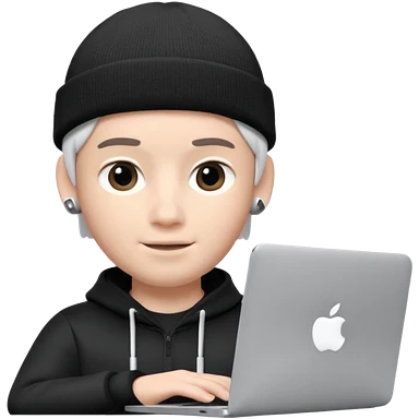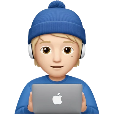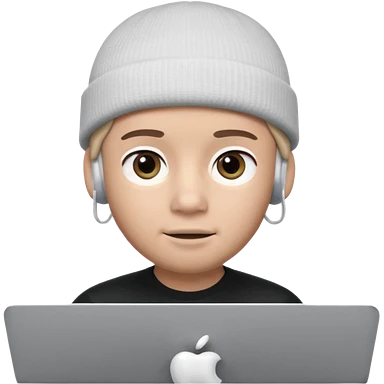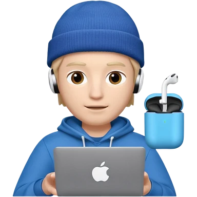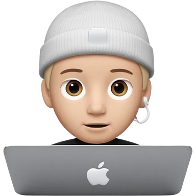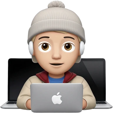 Apple Memoji–style 3D avatar, front-facing, centered. Young male wearing a dark beanie and white AirPods, behind a silver laptop. Big expressive eyes, smooth cartoon skin, soft lighting, white background, high quality. emoji | AI Emoji Generator