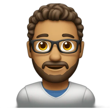 apple-style emoji of a young male software engineer, dark brown hair, hazel eyes, dimple, smiling and winking, tech t-shirt, using a MacBook with Apple logo, light gray background emoji