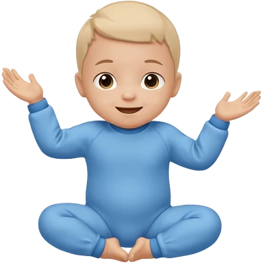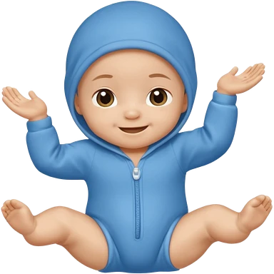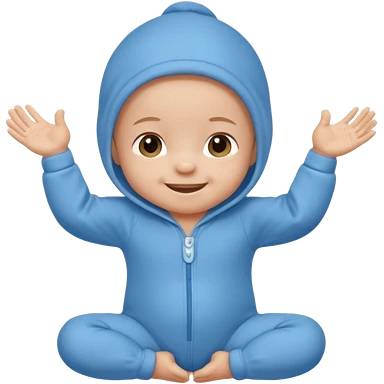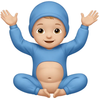 A smiling newborn baby wearing a blue onesie, moving its arms and hands. emoji