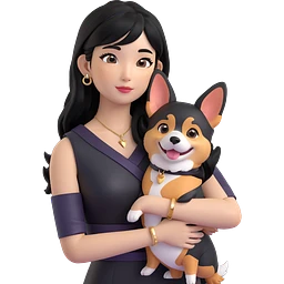 apple-style emoji of an Asian girl with long hair and wispy deep side bangs, wearing a black leather dress, gold earrings, false lashes, and a 3/4 sleeve tattoo on her left arm, hugging a happy red head tri-color corgi, simplified, clear, emoji-likeemoji