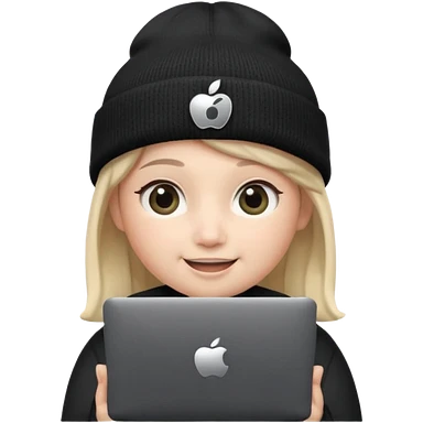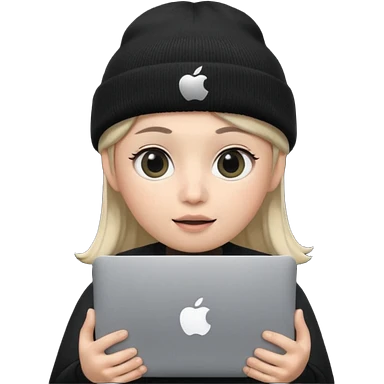 Apple-style Memoji face with big eyes and black beanie, holding silver laptop covering mouth with solid black pear logo (no bite), clean soft lighting, simple round background. emoji | AI Emoji Generator