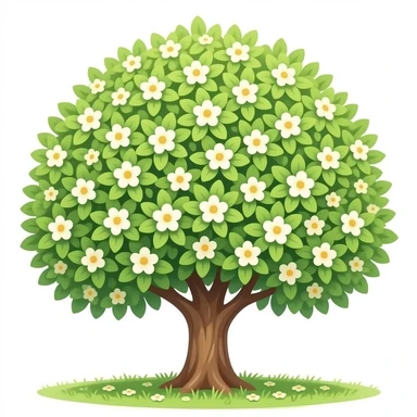 Apple-style blooming tree, round soft green canopy. Small white and yellow flowers inside the leaves emoji