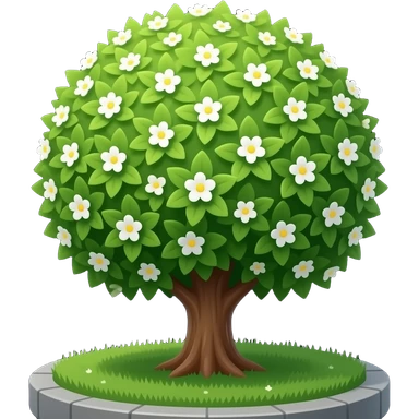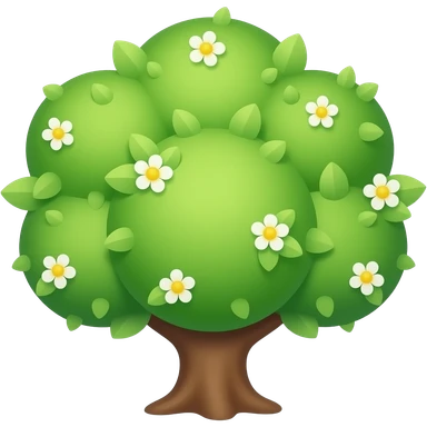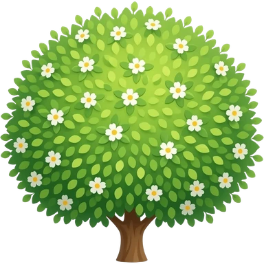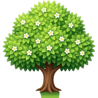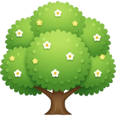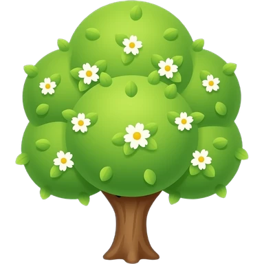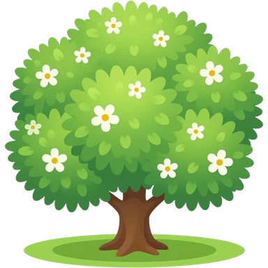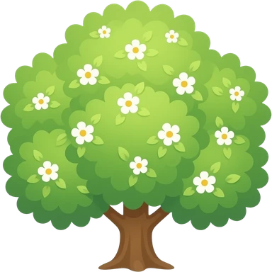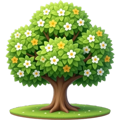 Apple-style blooming tree, round soft green canopy. Small white and yellow flowers inside the leaves emoji