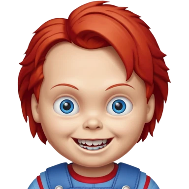 Chucky doll emoji with orange hair, blue overalls, mischievous grin, apple style emoji emoji