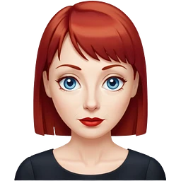 Middle-aged woman with fair skin, wider oval face, blue eyes, thin eyebrows, small nose, red lips, dark red hair with straight bangs, age-appropriate features, wearing a black blouse emoji