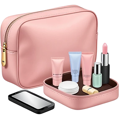 Pastel pink cosmetic travel pouch with skincare minis, clean setup emoji