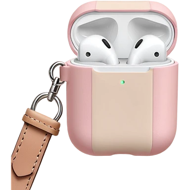 Pastel pink AirPods case on top of a beige travel journal, minimal setup emoji