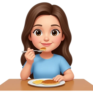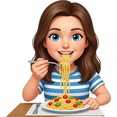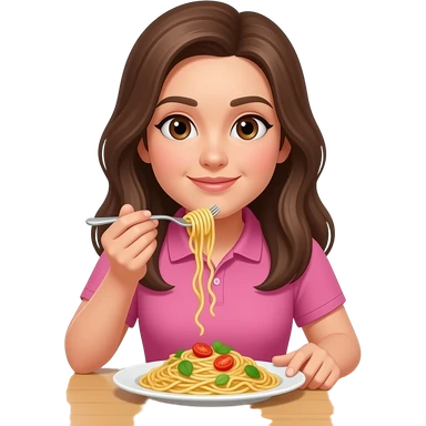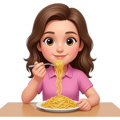 Az arca ne gyerekes legyen hosszú barna haja legyen és az asztalnál egyen spagettit barna szeme legyen és rózsaszín poloja legyen ilyen tinédzer arcú legyen emoji