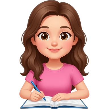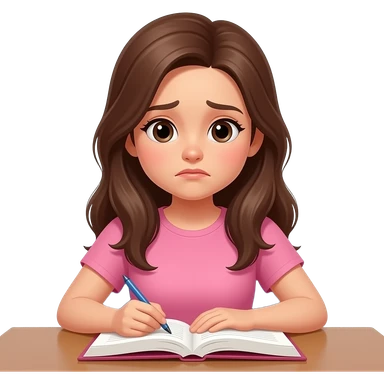 Barna hajú legyen rózsaszín felsőbe egy asztalnál üljön a lány és tanuljon a haja hosszú legyen és az arca az ne ilyen gyerekes legyen emoji