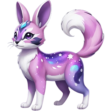 Colorful black-violet-indigo-purple-pink-gradients nebulae nebula white stars-sparkles-markings galactical shiny white-stars-patterned glorious iridescent divine exotic cute cool beautiful realistic Meloetta-caracal-civet-sergal-bunny-oncilla-animal-Fakémon-hybrid-fursona (full body) emoji