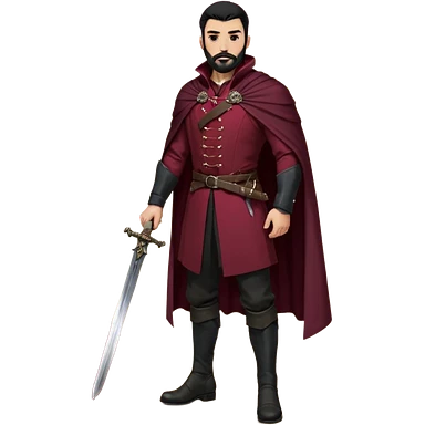 Hombre de unos 30-40 años, alto, fuerte.. Rostro anguloso, barba bien recortada, cejas marcadas, mirada dura y orgullosa. Castaño oscuro o negro, peinado hacia atrás. Ropa de noble — chaqueta ajustada, capa corta, botas altas y espada al cinto. Colores oscuros (rojo vino, negro, granate) emoji