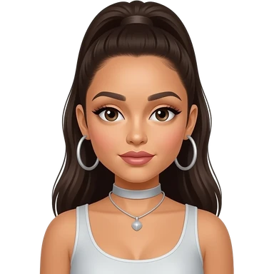 Ariana Grande with brown eyes, long golden brown ponytail hair, lavender pink metallic crop top and long skirt, pink necklace and earrings emoji