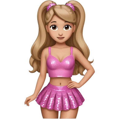 Ariana Grande with long dark blonde ponytail hair, pink sequin crop top emoji
