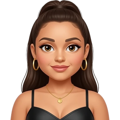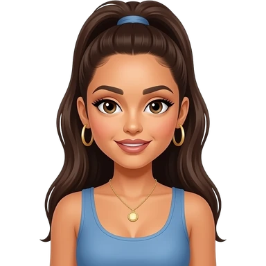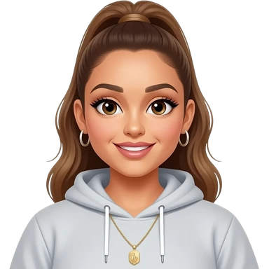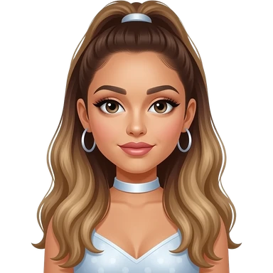 Ariana Grande with brown eyes, long golden brown ponytail hair, lavender pink metallic crop top and long skirt, pink necklace and earrings emoji