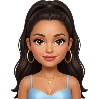 Ariana Grande with brown eyes, long golden brown ponytail hair, lavender pink metallic crop top and long skirt, pink necklace and earrings emoji