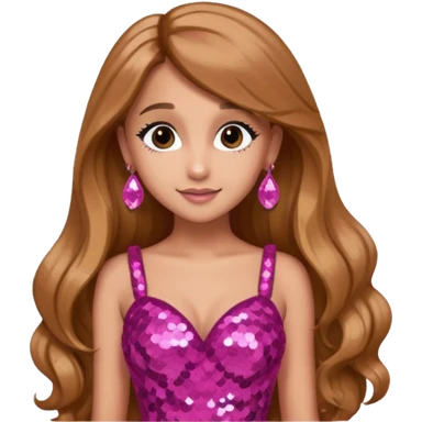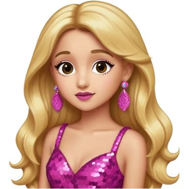 Ariana Grande with long golden brown hair, dark pink sequin dress, pink earrings emoji