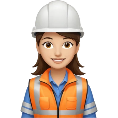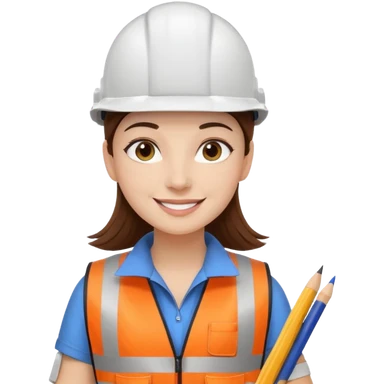 Arquitecta ojos marrones oscuros pestañas pelo marron por los hombros sonrie casco blanco con material de dibujo y chaleco reflecyante emoji