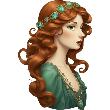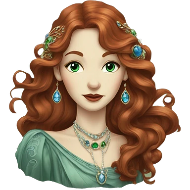 Art Nouveau lady with long swirling redbrown hair, bluegreen eyes, jewels emoji