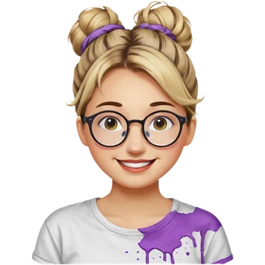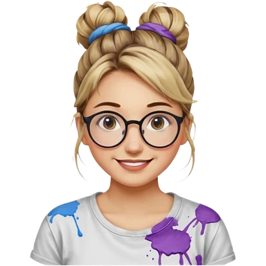 Artist Woman – messy bun, round glasses, paint stains on shirt. emoji | AI Emoji Generator