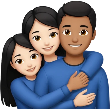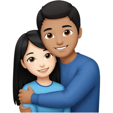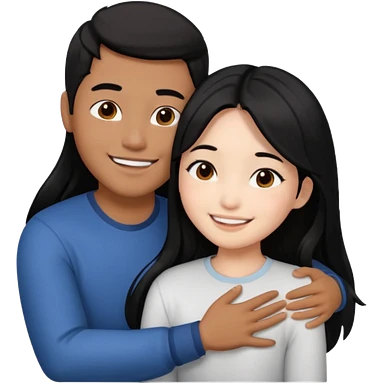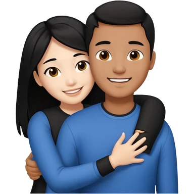 Asian guy with brown skin, short black hair, and a Asian girl with white skin and long black hair hugging emoji