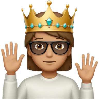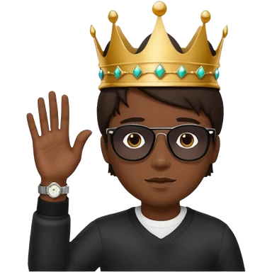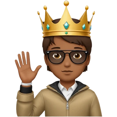 Un niño con cabello lacio no muy largo color marrón castaño,ojos marrones,piel no muy blanca, que tenga lentes de sol color negro,reloj en la mano derecha y una corona como sombrero emoji