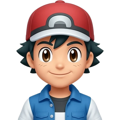 ASH ketchum, pokemon trainer with his spiky black hair showing from beneath his signature red and white baseball cap. emoji