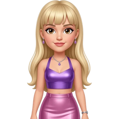 Ashley Roberts with brown eyes, long blonde straight bang hair, purple metallic halter crop top, pink metallic long skirt, necklace and earrings emoji