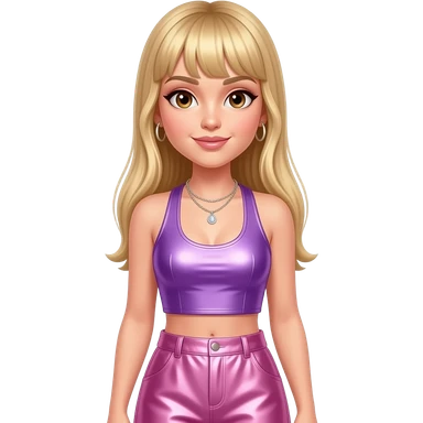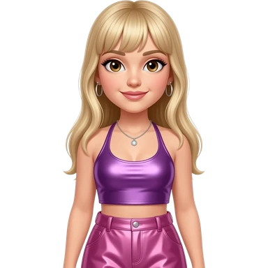 Ashley Roberts with brown eyes, long blonde straight bang hair, purple metallic halter crop top, pink metallic baggy long skirt, necklace and earrings emoji