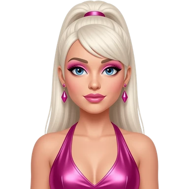 Ashley Roberts from The Pussycat Dolls with brown eyes, long blonde 2000s straight bang hair, pink eyeshadow and lipstick, hot pink metallic halter dress, earrings emoji | AI Emoji Generator