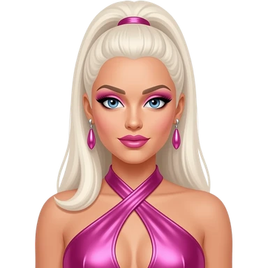 Kimberly Wyatt from The Pussycat Dolls with blue eyes, long white blonde straight high ponytail hair, pink eyeshadow and lipstick, hot pink metallic halter dress, earrings emoji