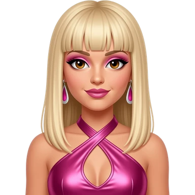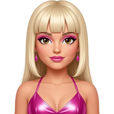 Ashley Roberts from The Pussycat Dolls with brown eyes, long blonde 2000s straight bang hair, pink eyeshadow and lipstick, hot pink metallic halter dress, earrings emoji