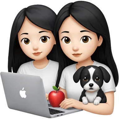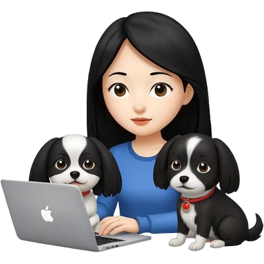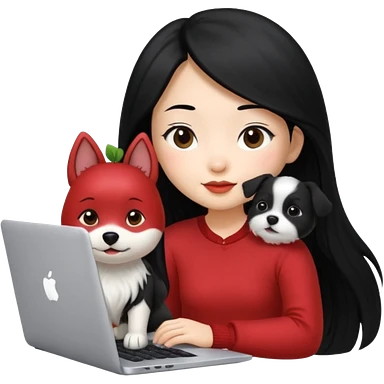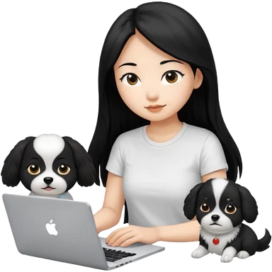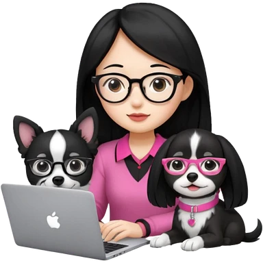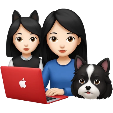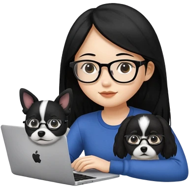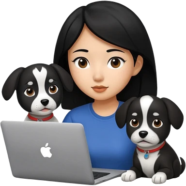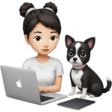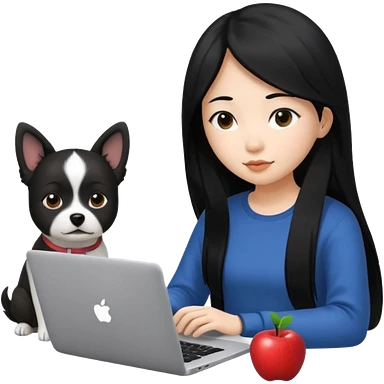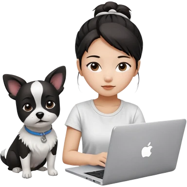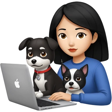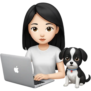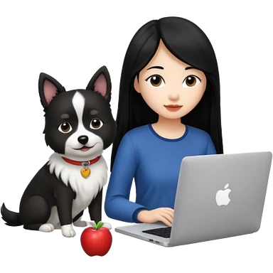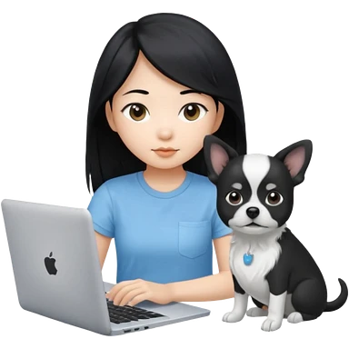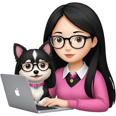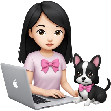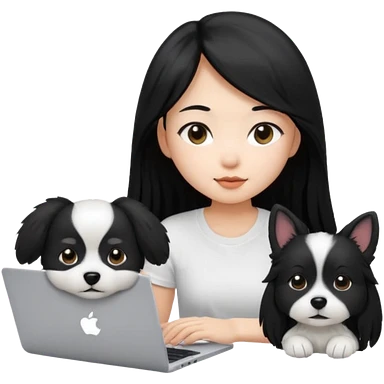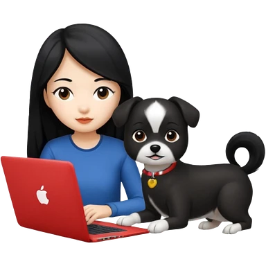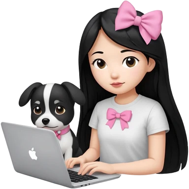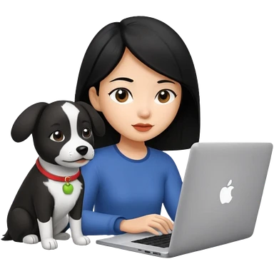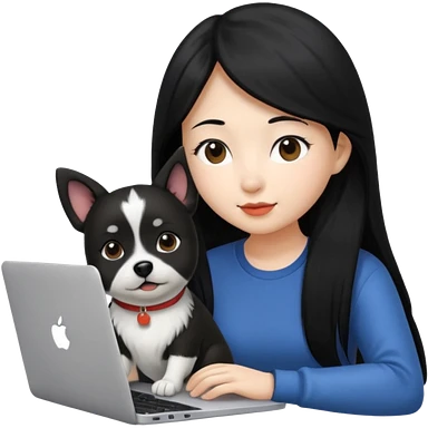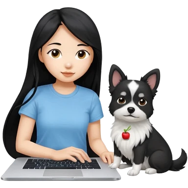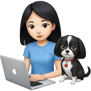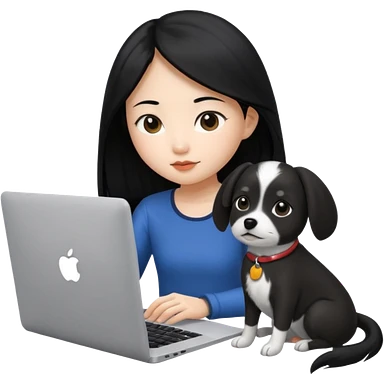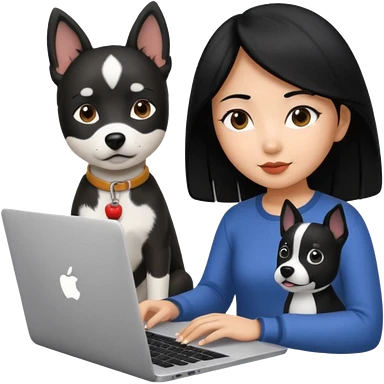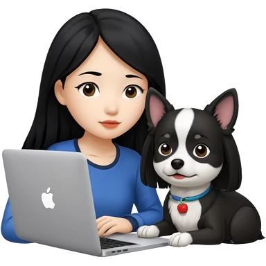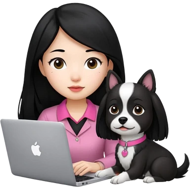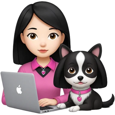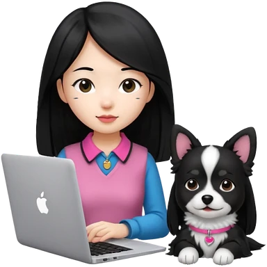 Asian girl with long black hair working on an Apple laptop, next to her is a small black and white dog with pink collar on emoji