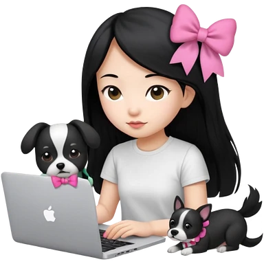 Asian girl long black hair, wearing a white t-shirt, working on an Apple laptop, next to her is a small black and white dog in pink bow emoji