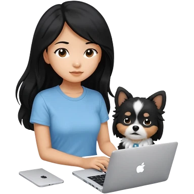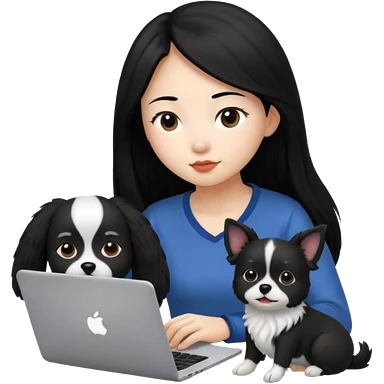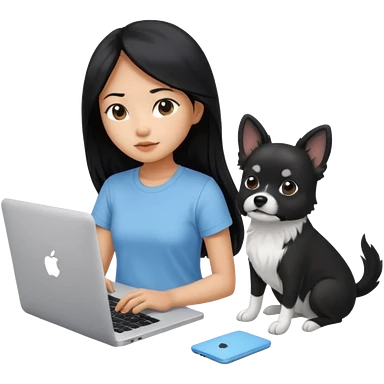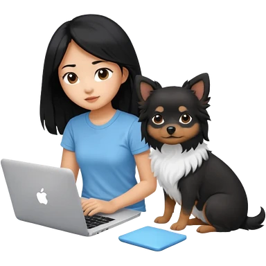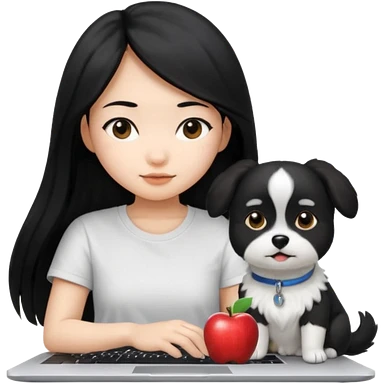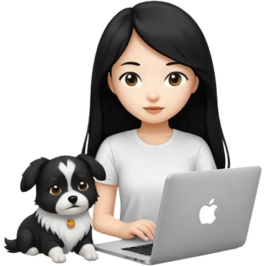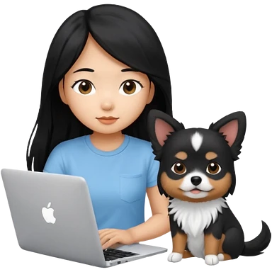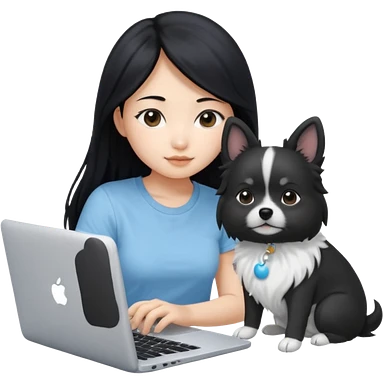 Asian girl with long black hair working on an Apple laptop, next to her is a small black and white dog with no collar on emoji