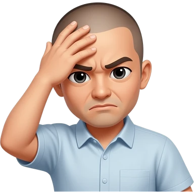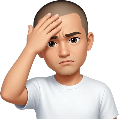 asian guy with shaved head with palm on foreheard covering face shaking his head in disbelief with white t shirt on emoji