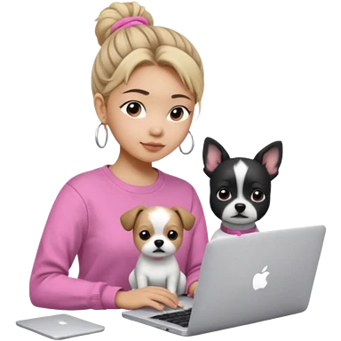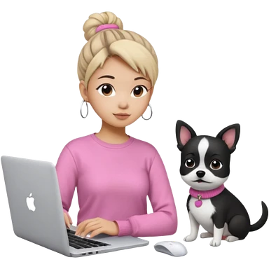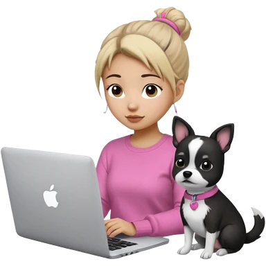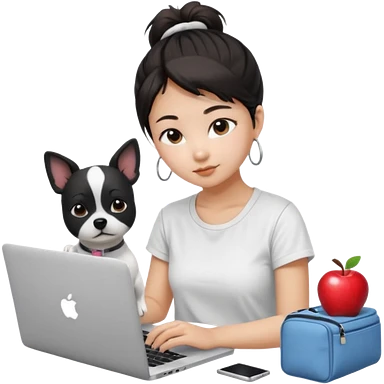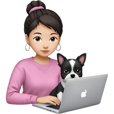 Asian girl with messy bun hair, wearing a white t-shirt, working on an Apple laptop, next to her is a small black and white dog in pink sweater emoji