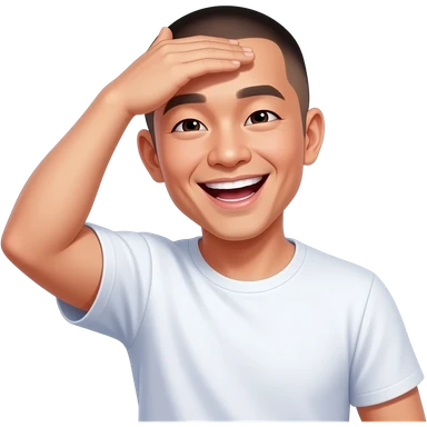 asian guy with shaved head with palm on foreheard laughing with white t shirt on emoji