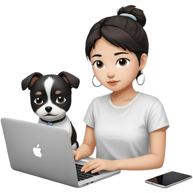 Asian girl with messy bun hair, wearing a white t-shirt, working on an Apple laptop, next to her is a small black and white dog emoji