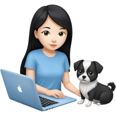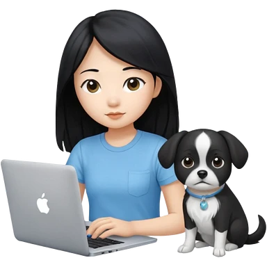 Asian girl with long black hair, wearing a light blue t-shirt, working on an Apple laptop, beside a small black and white dog emoji