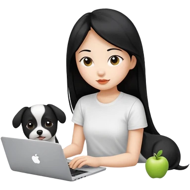 Asian girl long black hair, wearing a white t-shirt, working on an Apple laptop, next to her is a small black and white female dog emoji