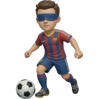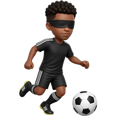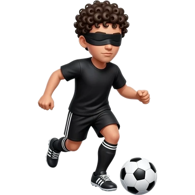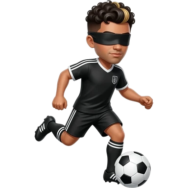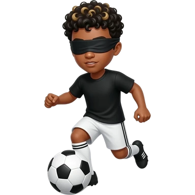 make me a soccer player dribbling the ball blindfolded mke him have black short curly hair with black shirt and short emoji