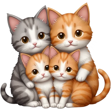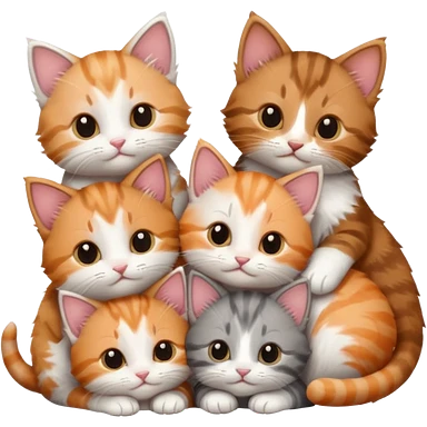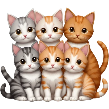 6 tiny kittens cuddling together all different colours, the first one is grey and white, the second is ginger and white and the third is brown tabby and white emoji