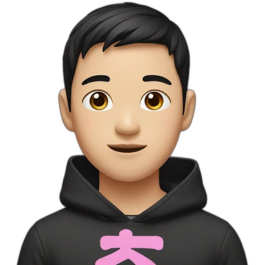 Asian boy, with black hair wearing a black hoodie with “ねこ” in pink lettering emoji