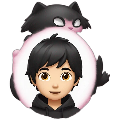 Asian boy, with fluffy black hair wearing a black hoodie with “ねこ” in pink lettering emoji