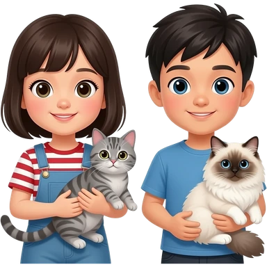 Asian girl holding american shorthair gray tabby cat and Asian boy holding ragdoll cat emoji