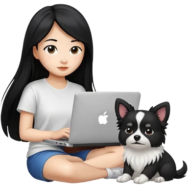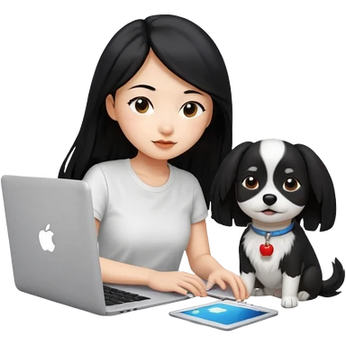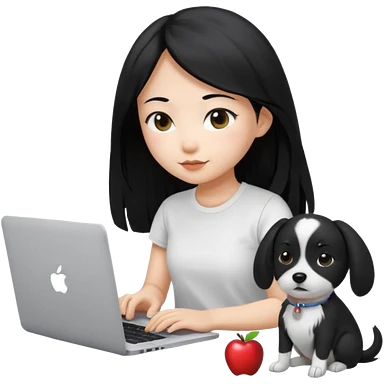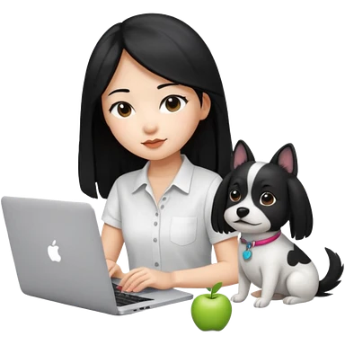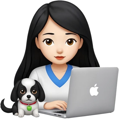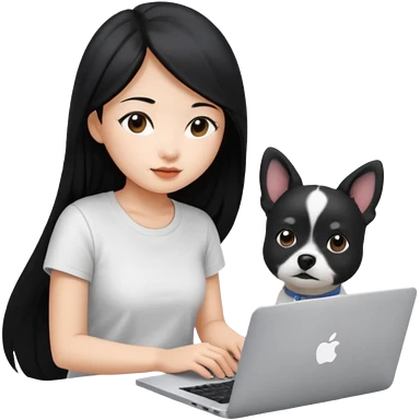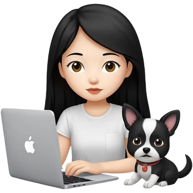 Asian girl with long black hair working on an Apple laptop, next to her is a small black and white dog with no collar on emoji