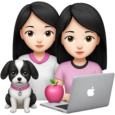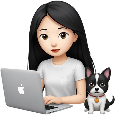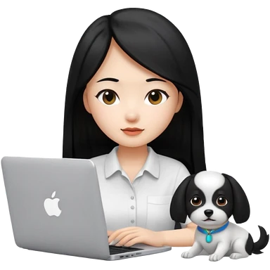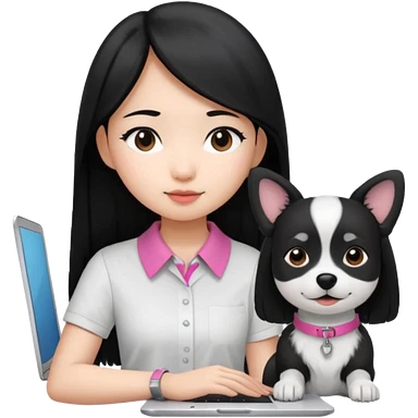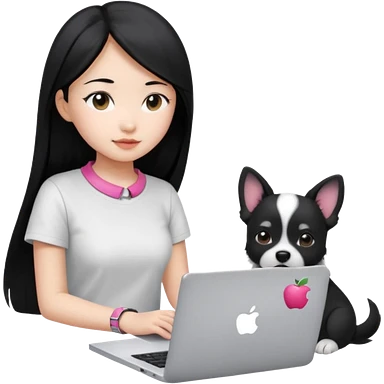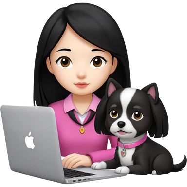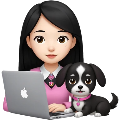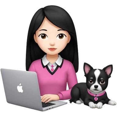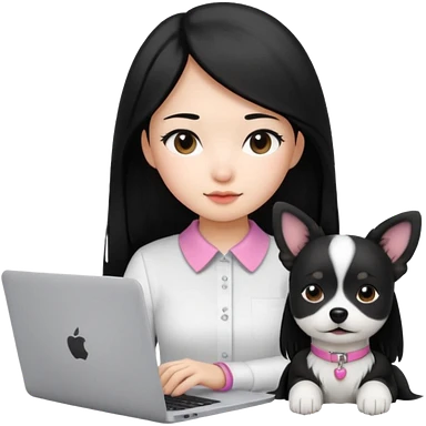 Asian girl with long black hair working on an Apple laptop, next to her is a small black and white dog with pink collar on emoji | AI Emoji Generator