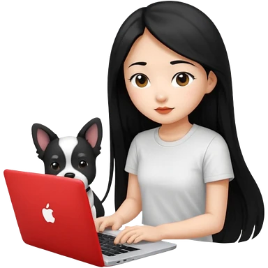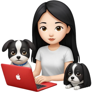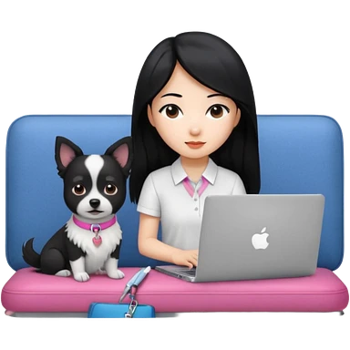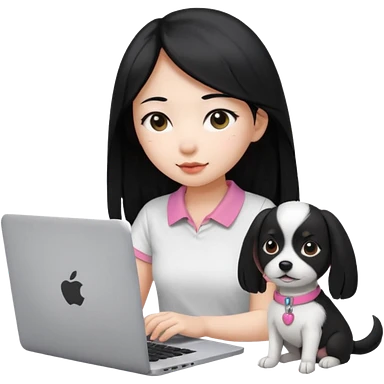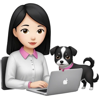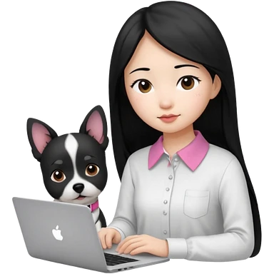 Asian girl with long black hair working on an Apple laptop, next to her is a small black and white dog with pink collar on emoji