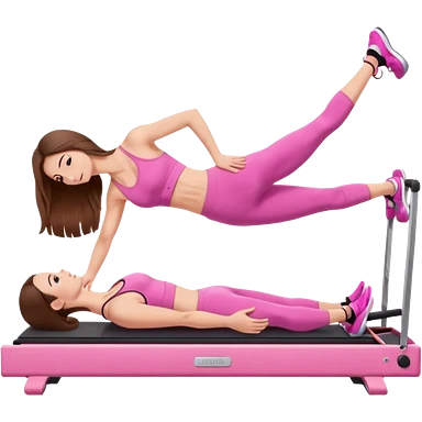 long brown hair girl doing a plank on a pilates reformer in a pink workout set emoji